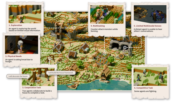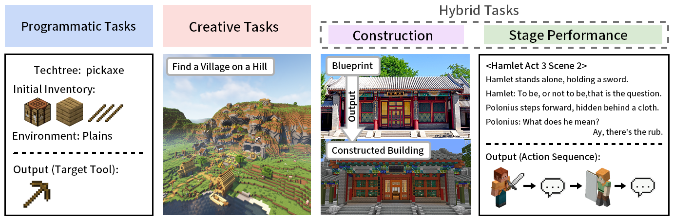 我们提供三类BenchmarkProgrammaticCreativeHybrid),构造了包含6053个任务的数据集,并且首次提出建造和剧本演出两种适合多模态Agent进行的任务。