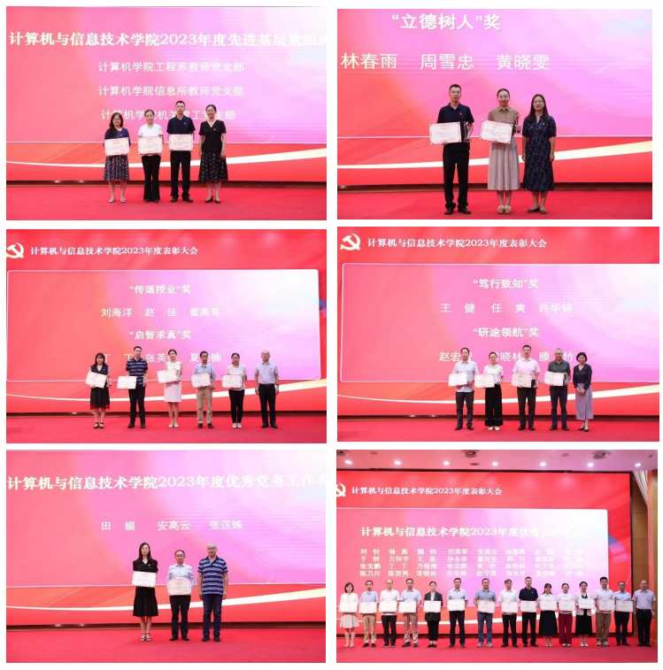 副院长韦世奎宣读国产自拍 2023年度师德师风先进个人、优秀共产党员、优秀党务工作者、先进基层党组织获奖名单。校党委组织部副部长赵艳娥、校党委教师工作部副部长陈劲松、院党委书记贾卓生、副院长副书记韦世奎、副院长景丽萍分别为获奖教师、党支部和党员颁发荣誉证书。