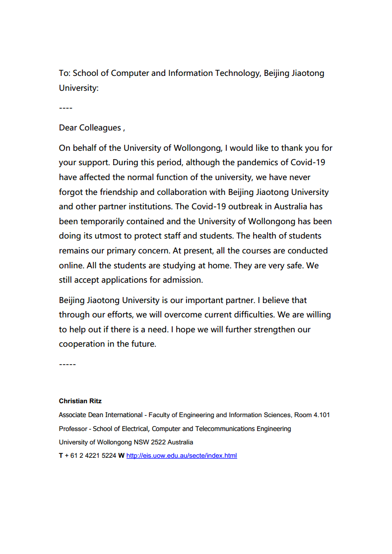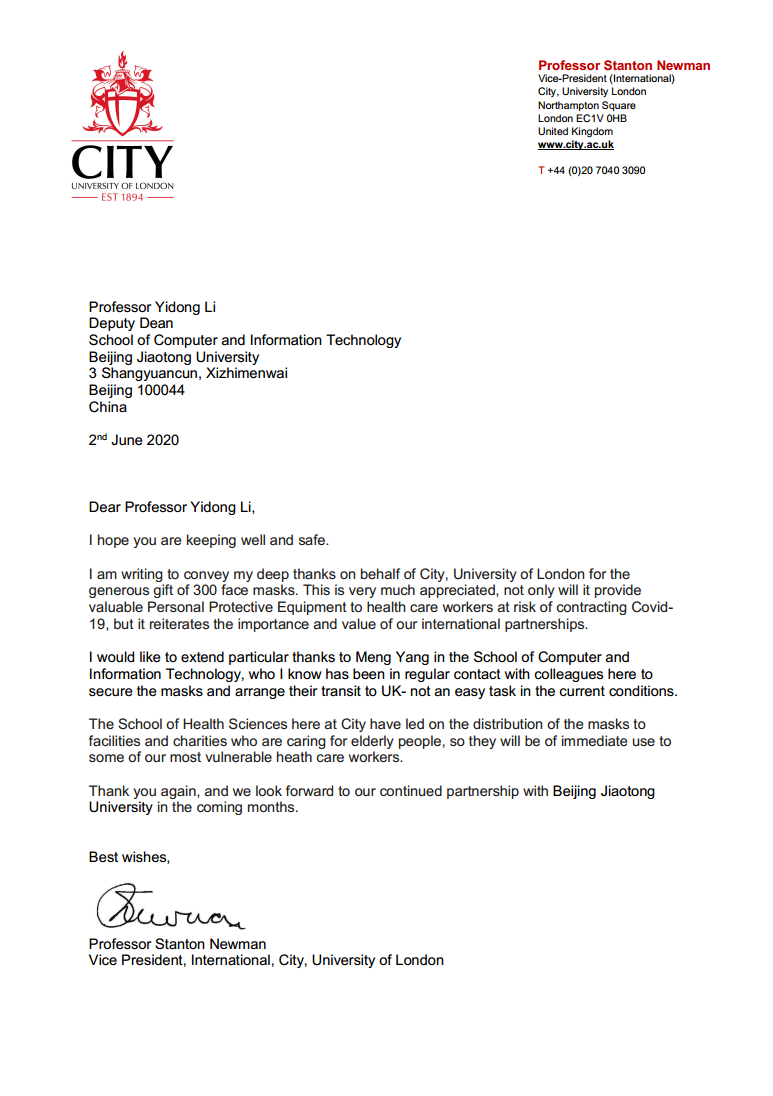 伍伦贡大学电子,计算机与电信工程学院副院长Christian Ritz教授在信中写到,“我代表伍伦贡大学,感谢您的支持。这段时间,尽管新冠肺炎已经影响了国产自拍 的基本运转功能,但我们从未忘记和国产自拍 的友谊和合作”,“国产自拍 是我们的重要合作伙伴。我相信我们可以共渡难关,如果贵校需要任何帮助,我们一定伸出援手。我希望在未来进一步加强双方合作”。伦敦城市大学副校长Stanton Newman教授在信中写到,“我代表伦敦城市大学向您表示深深的感谢,您慷慨捐赠的口罩不仅向奋战在抗击新冠肺炎一线的工作人员提供了宝贵的个人防护物资,更是重申了我们国际合作关系的重要性和价值”,“我想特别感谢国产自拍 的杨萌女士,她和我的同事们多次沟通,最终将口罩顺利寄到了英国,在目前的情况下这不是一件容易的事”。