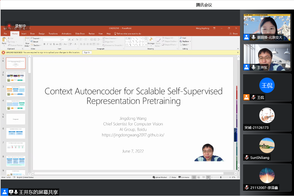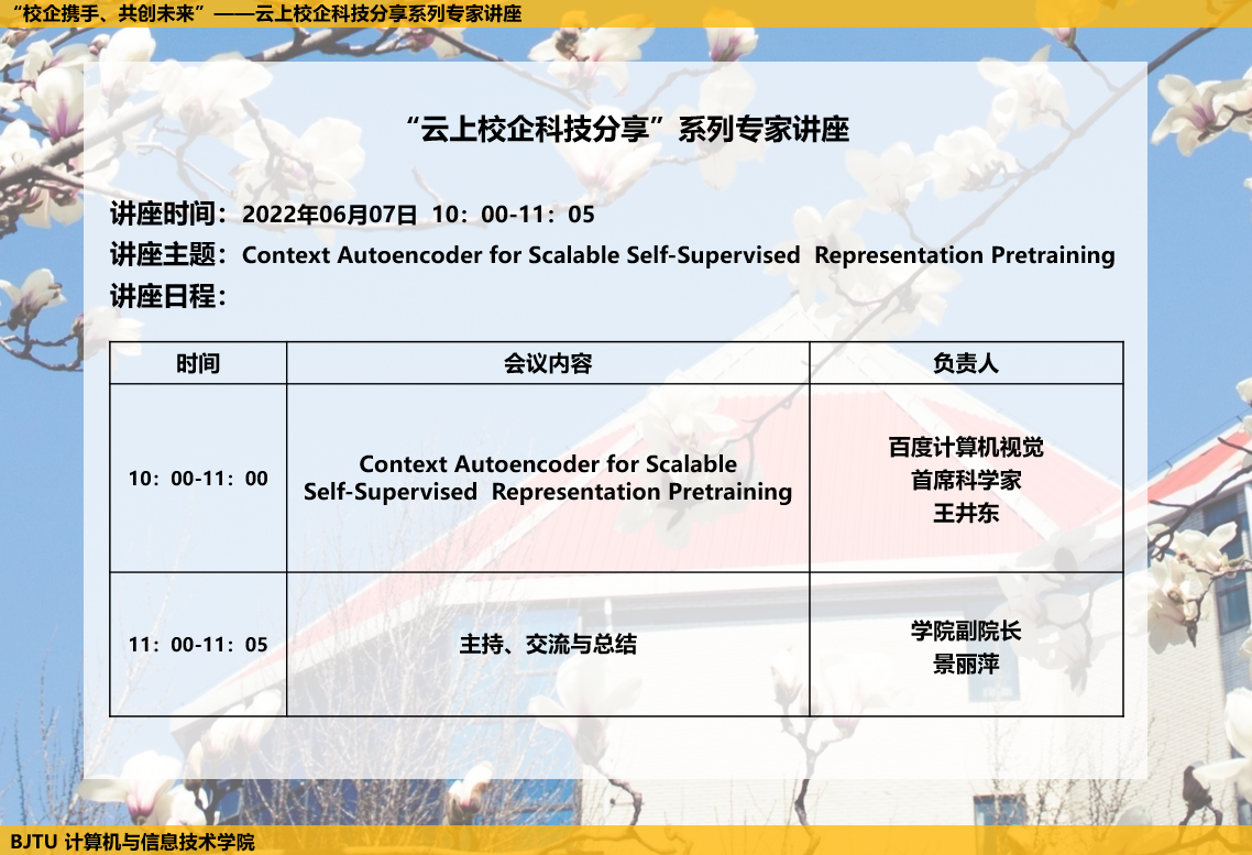 2022年6月7日上午,国产自拍 计算机与信息技术学院“云上校企科技分享系列专家讲座”活动有幸邀请到百度计算机视觉首席科学家王井东,讲座主题为 “Context Autoencoder for Scalable Self-Supervised Representation Pretraining”。160余位师生全程参与讲座。