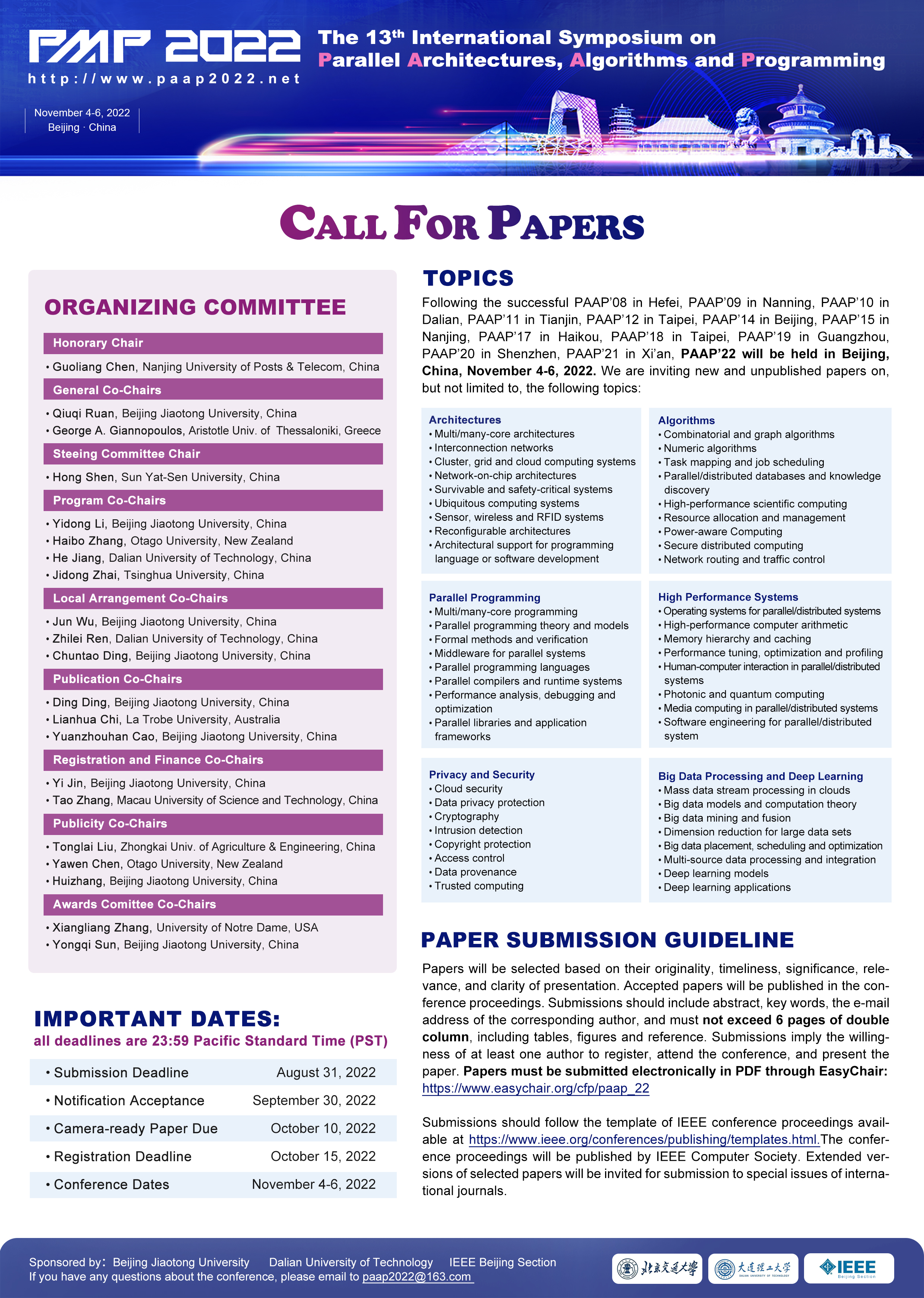 2022年第13届并行结构、算法与程序设计国际会议(PAAP 2022)将于2022年11月在中国北京召开,此次大会由国产自拍 计算机与信息技术学院主办。大会致力于为学术界和工业界的科学家和工程师提供一个论坛,展示他们在并行结构、算法与程序设计各方面的研究成果和开发活动。欢迎各位老师和同学踊跃投稿、参会,共同探讨、交流相关领域的最新研究进展及面临的机遇与挑战。