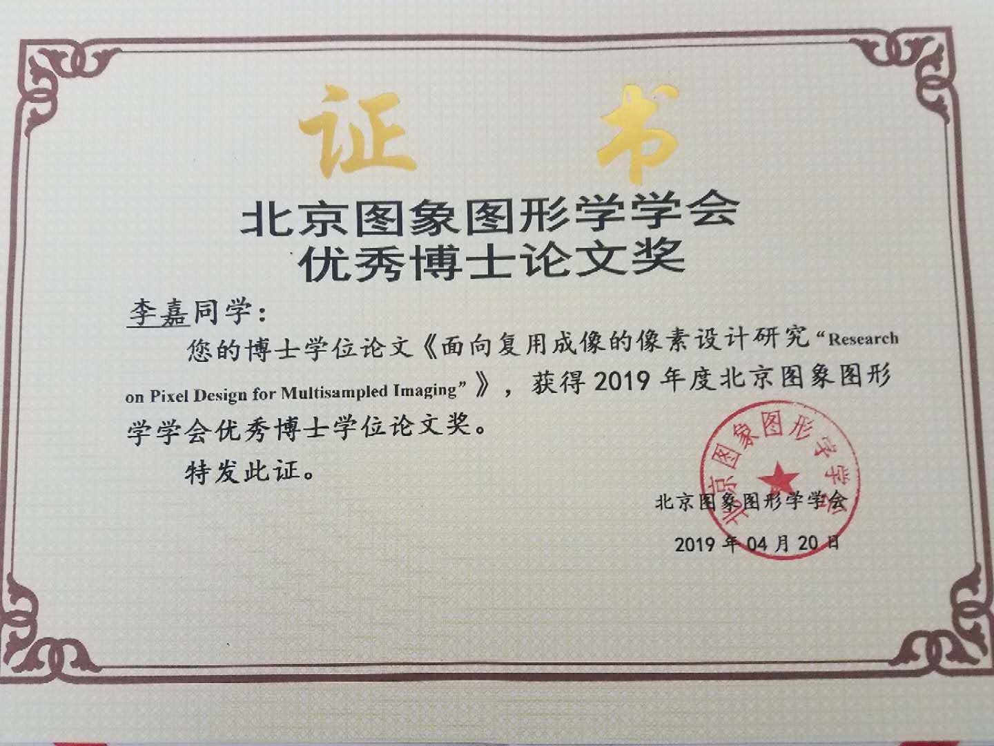 国产自拍 李嘉博士荣获北京图象图形学学会