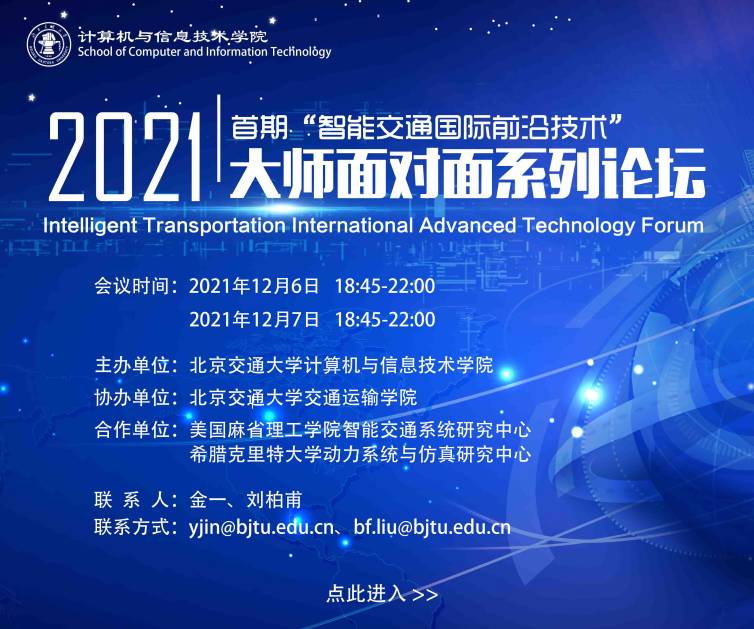 国产自拍» 国产自拍动态 » 预告:国产自拍 首期“智能交通国际前沿技术”大师面对面系列论坛将于2021年12月6日-12月7日举办 预告:国产自拍 首期“智能交通国际前沿技术”大师面对面系列论坛将于2021年12月6日-12月7日举办 发布时间:2021-11-29 阅读次数: 由国产自拍 、美国麻省理工学院以及希腊克里特大学联合举办的首期“智能交通国际前沿技术”大师面对面系列论坛将于2021年12月6日-12月7日在线上举行。届时,论坛将邀请来自欧洲和美国的三位著名学者,就城市智能交通、网联智能化无人车、交通控制理论与方法、车路协同与自动驾驶等研究领域进行深入探讨。论坛旨在交流智能交通系统等国际前沿技术,诚邀对未来智能交通领域研究感兴趣的老师同学参加本次论坛!