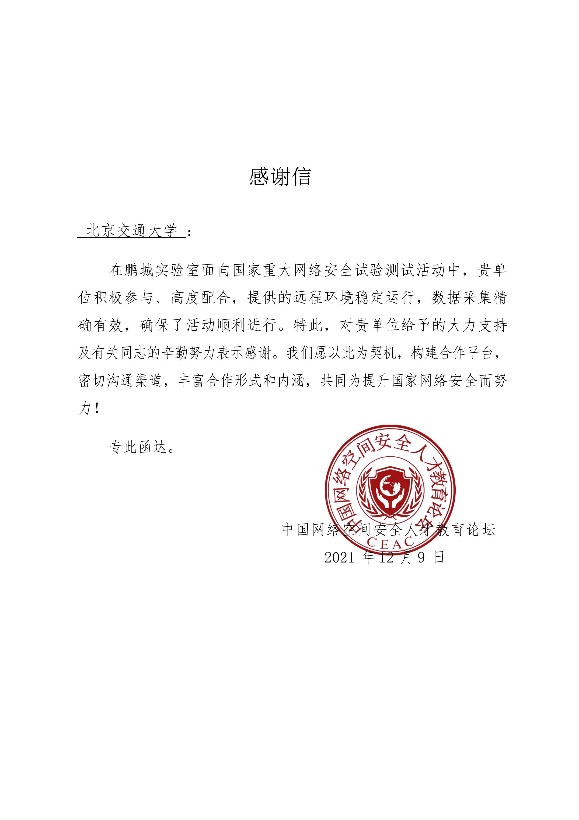 国产自拍 信安团队参与国家重大网络安全试验测试活动获感谢信