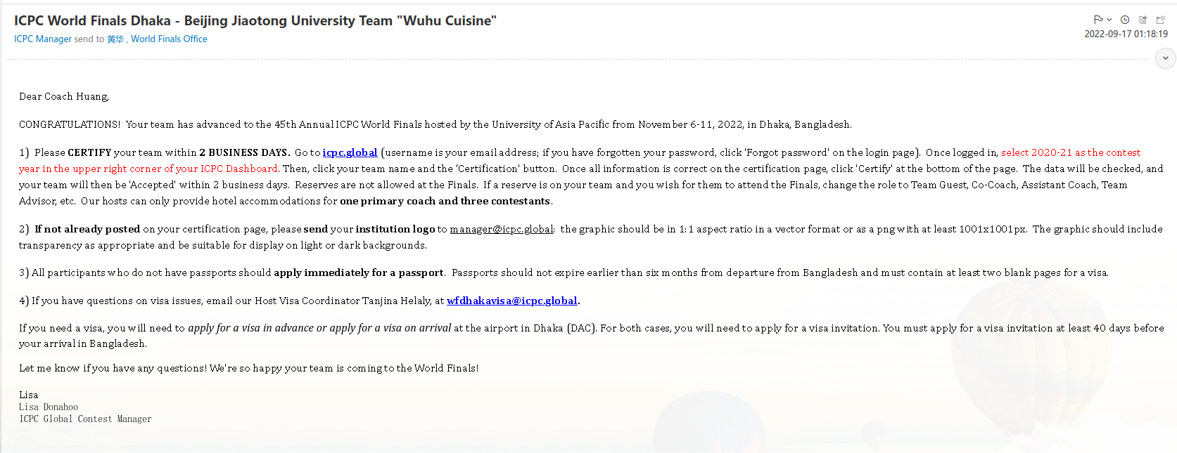 图2 ICPC总部通知国产自拍 晋级全球总决赛的邮件