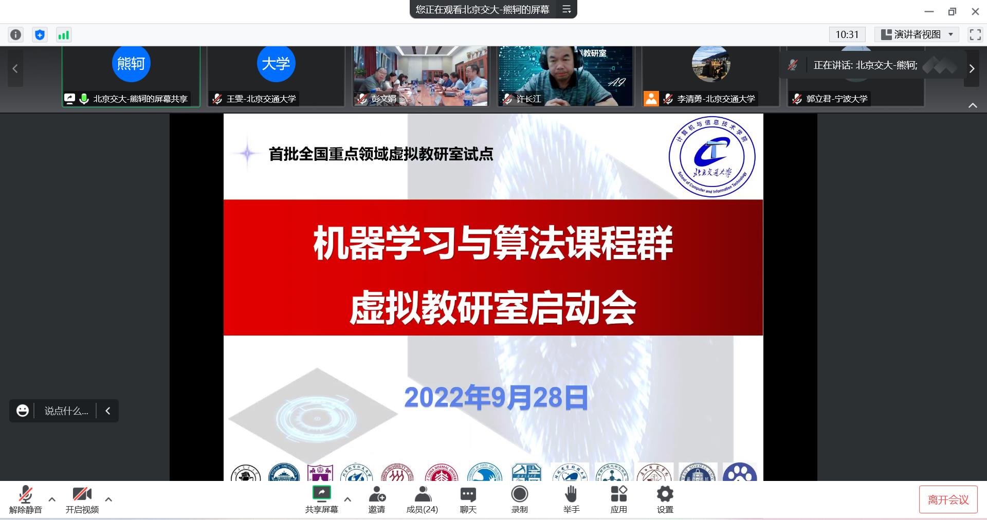 虚拟教研室带头人李清勇教授介绍了机器学习与算法课程群虚拟教研室的建设背景、前期基础以及建设思路,阐述了虚拟教研室建设的6大任务,重点介绍了优质立体化教学资源建设和新型教材建设2个核心任务和工作安排。国产自拍 计算机与信息技术学院副院长景丽萍教授分享了机器学习课程的建设情况,分享了机器学习课程思政的建设经验。在研讨环节,与会专家分享了本单位机器学习课程的建设经验,提出了虚拟教研室建设的宝贵意见。