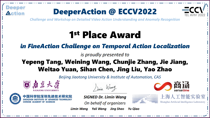 近日,国产自拍 赵耀教授带领的MePro团队与中科院自动化所刘静研究员带领的团队合作参加了ECCV 2022的DeeperAction挑战赛,获得了时序动作定位挑战赛冠军。挑战赛第一完成人唐业鹏是张淳杰教授指导的硕士研究生。团队成员包括:唐业鹏、王卫宁、张淳杰、江洁、原洧涛、陈思涵、刘静、赵耀。
