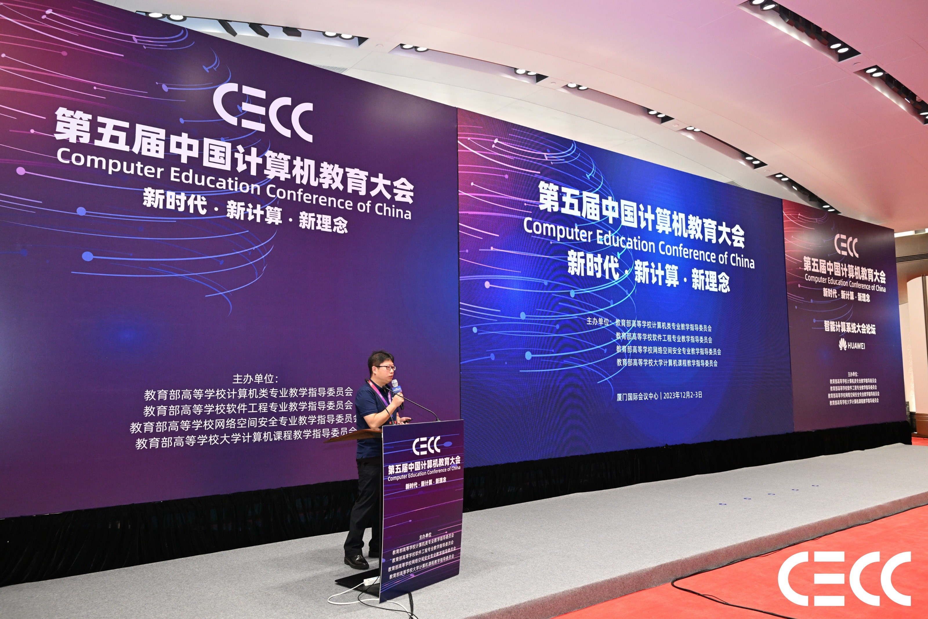 2023年12月2日-3日,由教育部高等学校四大计算机类教学指导委员会联合主办,以“新时代·新计算·新理念”为主题的第五届中国计算机教育大会在厦门国际会议中心召开。来自清华大学、北京大学、南京大学等5000名高校教师及包括华为、百度等在内的1000+企业代表参与本次大会,共话计算机、教育、技术及人才等产业的发展。国产自拍 副院长熊轲带队参加了本次大会,并受邀在智能计算机系统大会分论坛做题为“依智能基座,推101改革,育计算机人才”的主题报告。