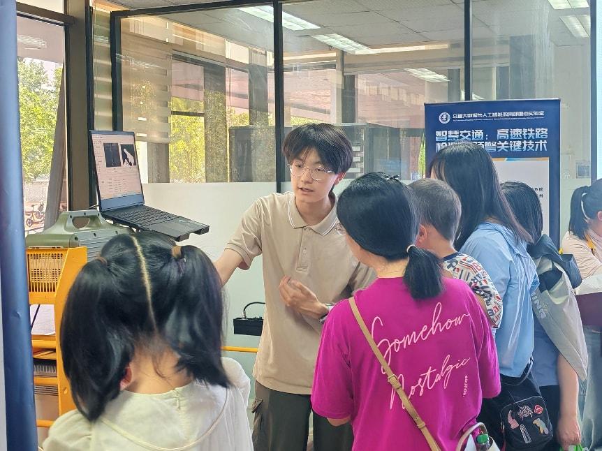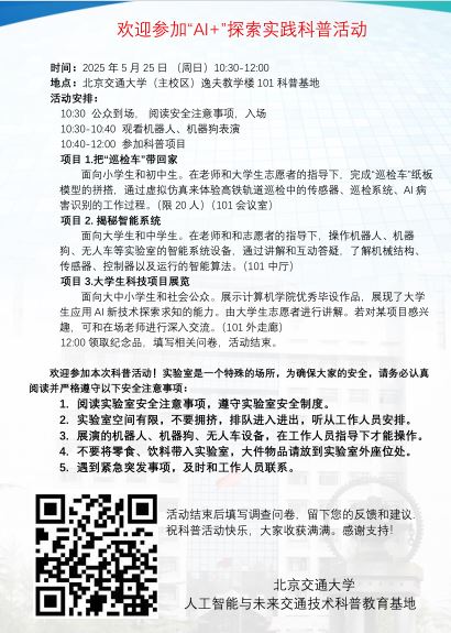 根据《科技部 中央宣传部 中国科协 关于举办2025年全国科技活动周和全国科技工作者日活动的通知》要求,为庆祝第九个全国科技工作者日,弘扬科学精神、普及科技知识,国产自拍 人工智能与未来交通技术科普教育基地举办系列科普活动。2025年5月25日,科普基地在逸夫教学楼101举办“AI+”探索实践活动。活动以“沉浸式体验科技魅力”为目标,通过揭秘智能系统(机器人互动、机器狗表演、无人车体验)、把“巡检车”带回家(AI+轨道运维、模型拼搭)、大学生科技项目展览等项目,为青少年打造了一场沉浸式AI科普盛宴,让社会公众近距离感受科技的魅力。