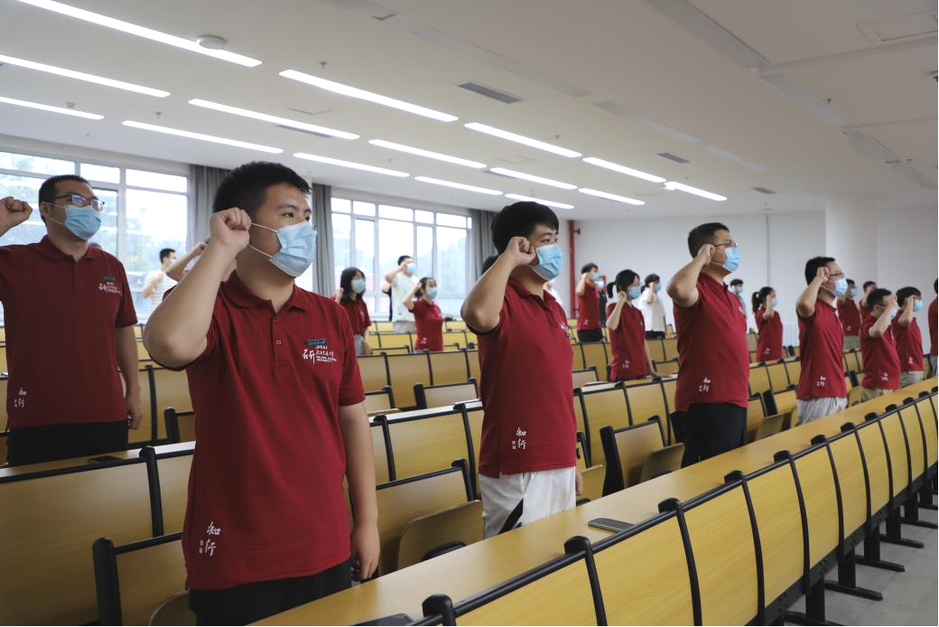 国产自拍 2021级唐山班全体新生在林瀚峰同学的带领下庄严宣誓,共同承诺身为交大学子,将秉承知行校训,弘扬交大传统,饮水思源,爱国荣校,勇做走在时代前列的奋进者、开拓者、奉献者,为实现成才梦、交大梦、中国梦而努力奋斗!